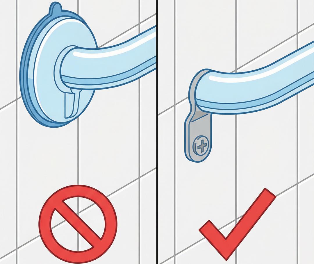 特别强调:浴室、厕所墙面瓷砖多有缝隙或纹理,加上长期水汽浸泡,导致吸盘式扶手很容易脱落。禁止使用吸盘,必选打孔安装!