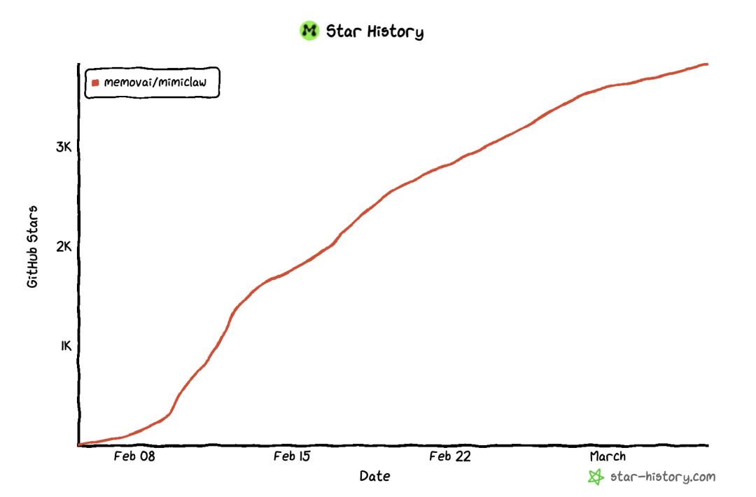 MimiClaw 在 GitHub 上的星标增长数据|图片来源:GitHub
