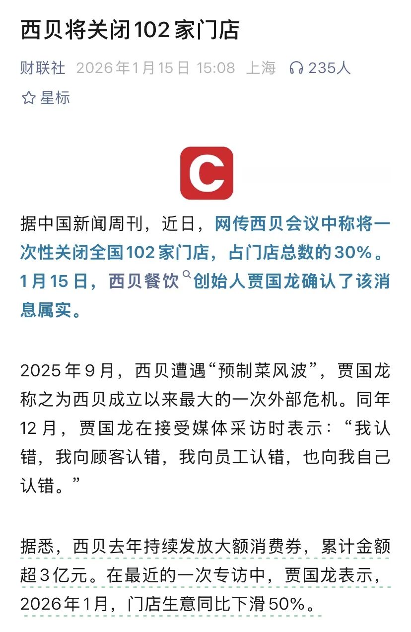 今年1月,贾国龙在接受采访时让步,说“自己的视频看多了之后,发现确实‘爹味儿’很重”。可惜,他的醒悟太晚,此时的西贝已来到生死关头。