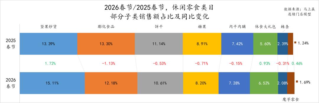 在上述大类中,我们进一步精选了休闲零食、饮料、酒、乳制品、调味品、方便速食、速冻食品几个大类,通过类目内不同子类目的占比变化、各子类销售额同比增速、单位克重下均价,以及TOP份额增长集团变化等,来观察2026年春节这些类目正在发生何种趋势性的变化。