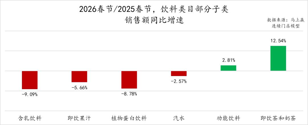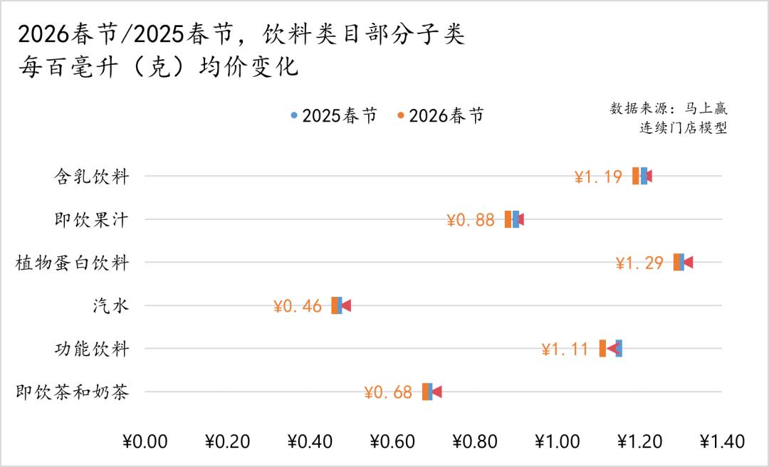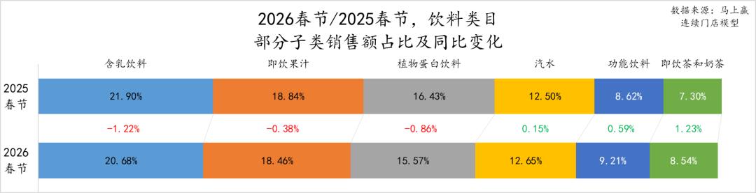 从销售额同比来看,即饮茶和奶茶、功能饮料类目销售额同比增长为正,其中即饮茶和奶茶销售额同比增速超过12%,为观察的饮料类目中销售额同比增速最高的子类。而含乳饮料、植物蛋白饮料的销售额同比下滑较为严重,2026春节同比2025春节销售额同比下滑均超过8%。