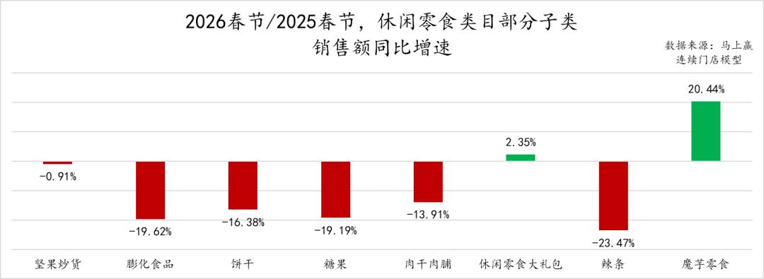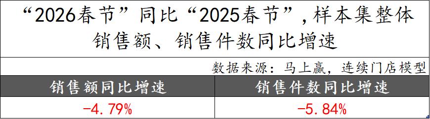 马上赢也曾在2025年、2024年都基于当年春节与前一年春节的情况进行过研究。在2025年春节同比2024年春节,这一销售额同比数字大约下滑约7%;在再早一年的2024年春节同比2023年春节,这一数字大约同比下滑约10%左右。各年之间的数据因划定时间段、样本情况等原因并不完全有可比性,但从趋势上看,整体的下滑还是在收窄当中。