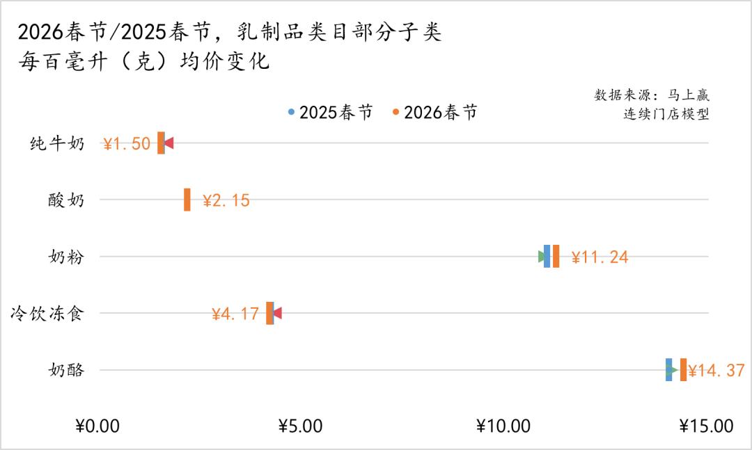 从类目的每百毫升(克)均价变化上来看,酸奶类目在两年春节的百毫升均价持平,无明显变化;纯牛奶、冷饮冻食类目有极小幅度的向下波动,整体较为稳定;值得注意的是奶粉、奶酪两个类目,2026春节同比2025春节,两个类目的每百毫升(克)均价均有着小幅度的上涨。结合上文中的占比、销售额同比来看,这两个类目占比、销售额同比均在2026年春节有所下滑,价格上升或与类目内头部集团/品牌为了缓解类目下行压力、守护利润水平而推行的市场策略相关。