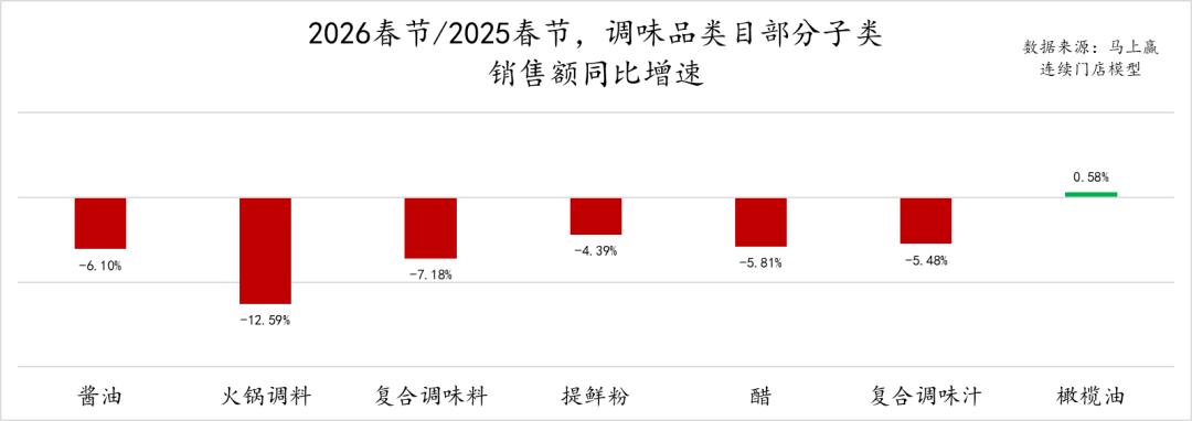 从销售额同比变化情况来看,仅有橄榄油的销售额同比增速为正,其余所有类目均为同比下滑。在上周发布的2025Q4调味品复盘中,我们就曾经观察到橄榄油类目在2025年呈现较为显著的增长(数据首发丨2025Q4调味品市场回顾),2026年橄榄油类目也或将延续这一趋势。其余类目中,除了火锅调料有超过10%的同比下滑外,其他类目销售额同比下滑幅度均在4%~10%之间,与调味品类目整体的销售额同比下滑幅度基本相近。