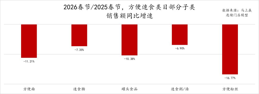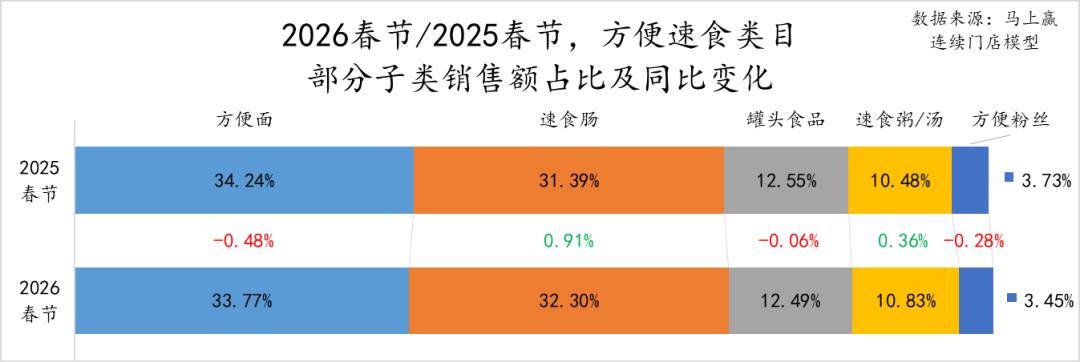 从2025、2026两年春节的占比变化上看,休闲零食的占比下滑最为明显,或与渠道碎片化、零食量贩业态进一步普及等有一定的关系,对传统线下零售业态中的该类目产品销售继续构成了一些影响;方便速食、调味品、速冻食品的占比也有小幅度的下滑;相比来说,饮料、酒、乳制品三个类目的占比有着较为明显的增长,意味着这些类目在传统线下零售中的重要性在提升。