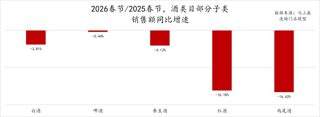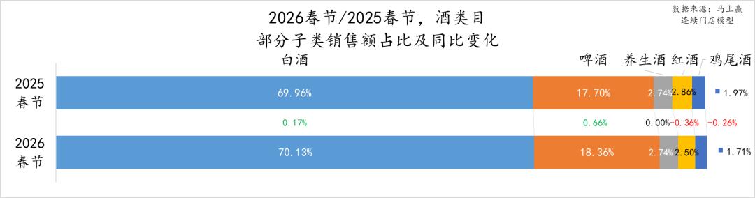 从占比及两年春节的占比变化上看,白酒在两年春节的占比均在70%左右,占据了酒类目在线下零售渠道中销售额的绝大多数;啤酒两年春节的占比均不足20%,但2026年春节同比2025年春节有将近1个点的占比提升,或是啤酒零售化加速的体现;红酒、鸡尾酒则有着一定程度的占比下滑,两个类目本身的占比均在2%左右,2026年春节同比2025年春节占比下滑约0.3%左右,对于两个类目本就不高的占比来说下滑较为明显。