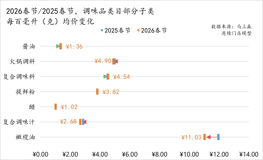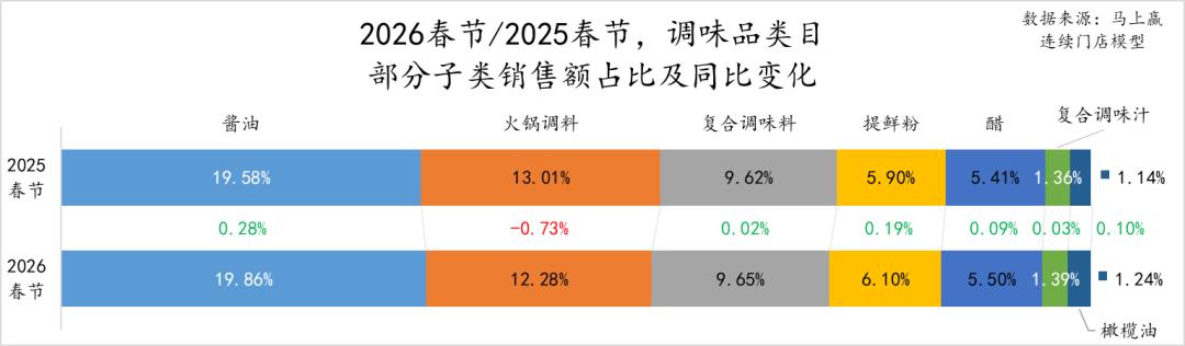 从占比上看,酱油、火锅调料、复合调味料占比较高,均在10%左右或以上,其中酱油、复合调味料有一定的占比同比上涨,火锅调料则有较大程度的占比同比下滑,火锅调料类目的占比同比下滑推测或也与春节较晚导致的气温以及餐饮习惯变化有一定的相关性。其余选择的类目,提鲜粉、醋、复合调味汁、橄榄油均有一定程度的占比上涨。