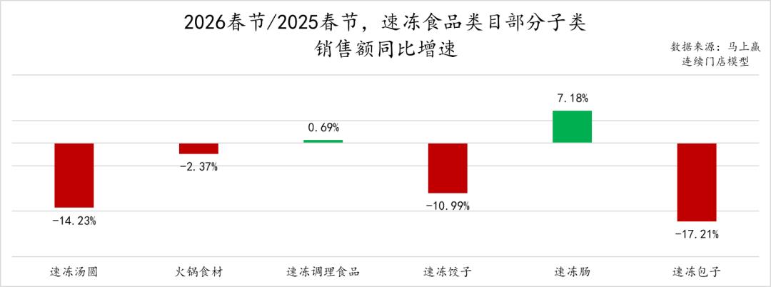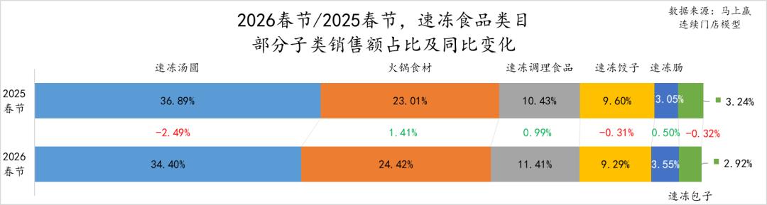 2026年春节同比2025年春节,速冻食品类目市场份额增长TOP5的集团分别为皇家小虎、安井、美是食品、思念和顶诺。其中,皇家小虎在2025年在速冻肠、手抓饼、速冻披萨、速冻调理制品等类目中均取得了较快的增长,其市场份额也因此同比较大幅度提升;安井除了在火锅食材类目中继续保持领先外,也积极布局速冻肠、手抓饼、速冻调理制品等类目,以其成熟的渠道能力取得了较好的成长;思念则一方面在经典速冻水饺、汤圆类目持续深耕,另一方面广泛涉猎速冻肠、速冻调理食品等类目。可以看到,不论是皇家小虎,还是安井、思念,速冻食品头部集团都在向着速冻全品类的方向发展,品类之间的隔阂与领先优势也正在变小。