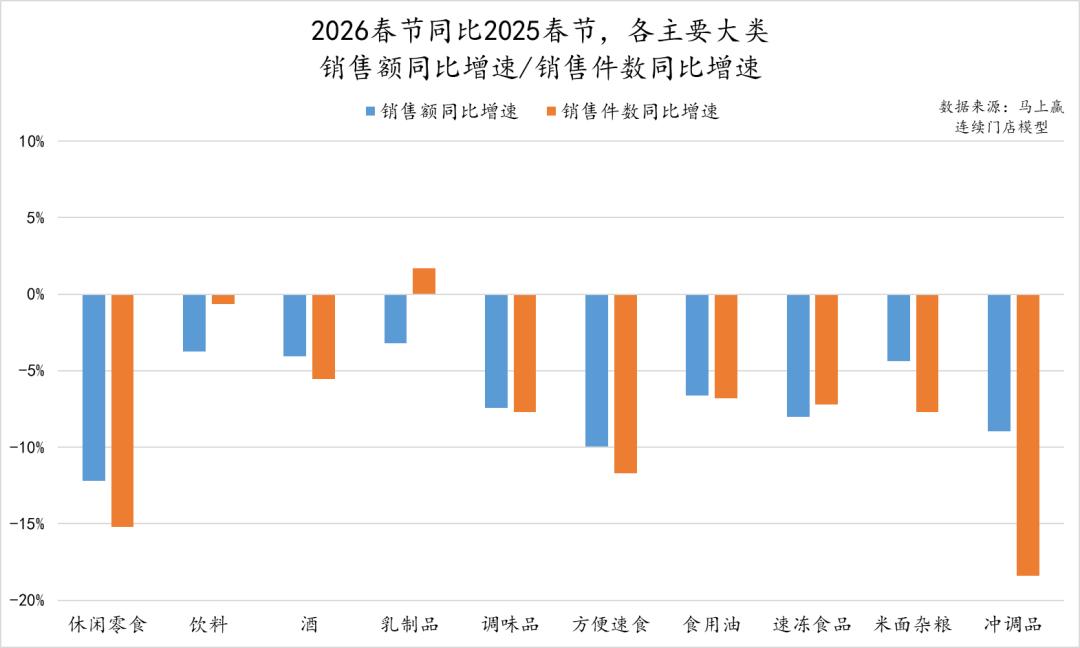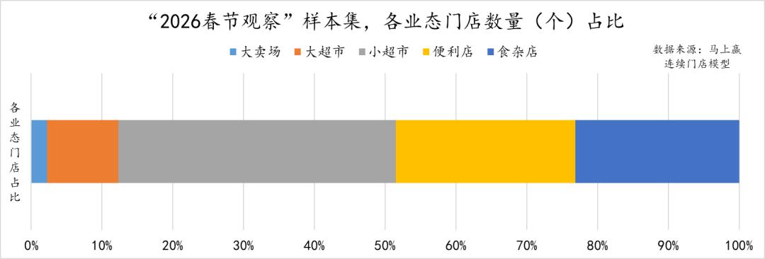 为更好的对齐日级别数据,消除春节期间闭店的门店对观察构成的影响,本次复盘使用的模型为马上赢连续门店模型,即样本门店在2025年春节、2026年春节都有正常营业,样本门店数量合计>38,000(个门店),数据范围为样本门店的全量Pos销售数据(烟酒、联营合营等pos外结算不含)。