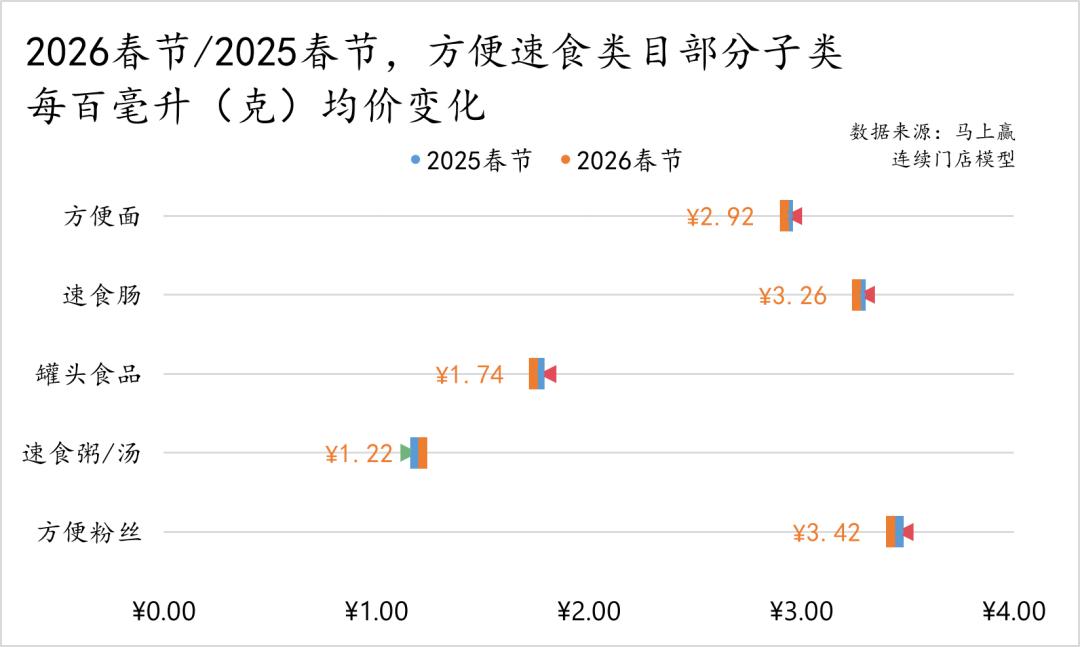 在两年春节的每百克均价变化上,方便速食类目下该部分子类的价格变化都不算大,其中方便面、速食肠、罐头食品、方便粉丝均有小幅度向下波动,速食粥/汤类目则有小幅度向上波动,总体变化都都不大,体现出各类目较为坚挺、稳定的价格水平。