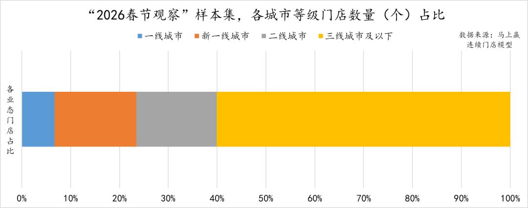 以门店数量(个)在样本总门店总量(个)中的占比计,其各业态、各地区、各城市等级占比如下: