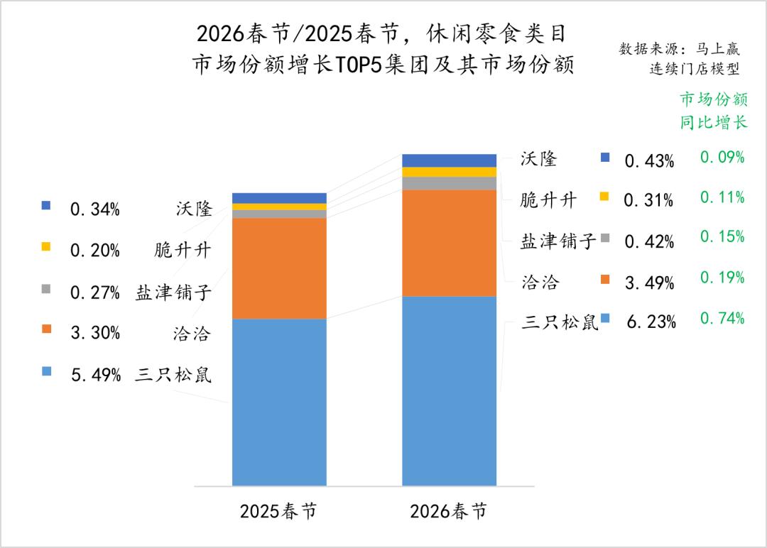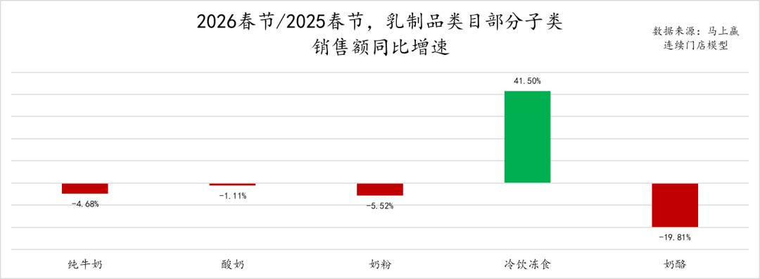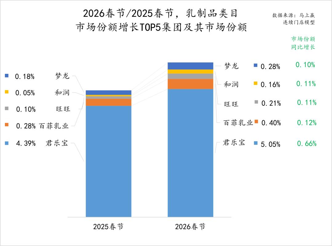 2026年春节同比2025年春节,乳制品大类中的市场份额同比增长TOP5集团分别是君乐宝、百菲乳业、旺旺、和润与梦龙。其中君乐宝集团在2025年受益于低温鲜奶、低温酸奶类目的增长,取得了较好的市场表现,马上赢也曾经在君乐宝集团赴港上市递表时进行过专题研究(图集丨君乐宝递表,专注低温的“乳业第三”),未来伴随着牛奶酸奶低温化浪潮,君乐宝在2026年或将有进一步的发展,值得持续关注。