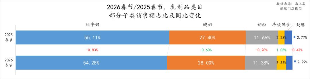 从乳制品的占比及占比同比变化上看,纯牛奶作为节礼中的首选其占比过半,但在2026春节同比2025年春节,占比有将近1%的下滑,或许可以说明部分消费者的节礼选择正在从纯牛奶中流出;占比同比下滑的类目还有奶粉、奶酪类目,其中奶酪在两年春节的占比约2.5%左右,其2026年春节占比同比2025年有接近0.5%的同比下滑,下滑较为显著。