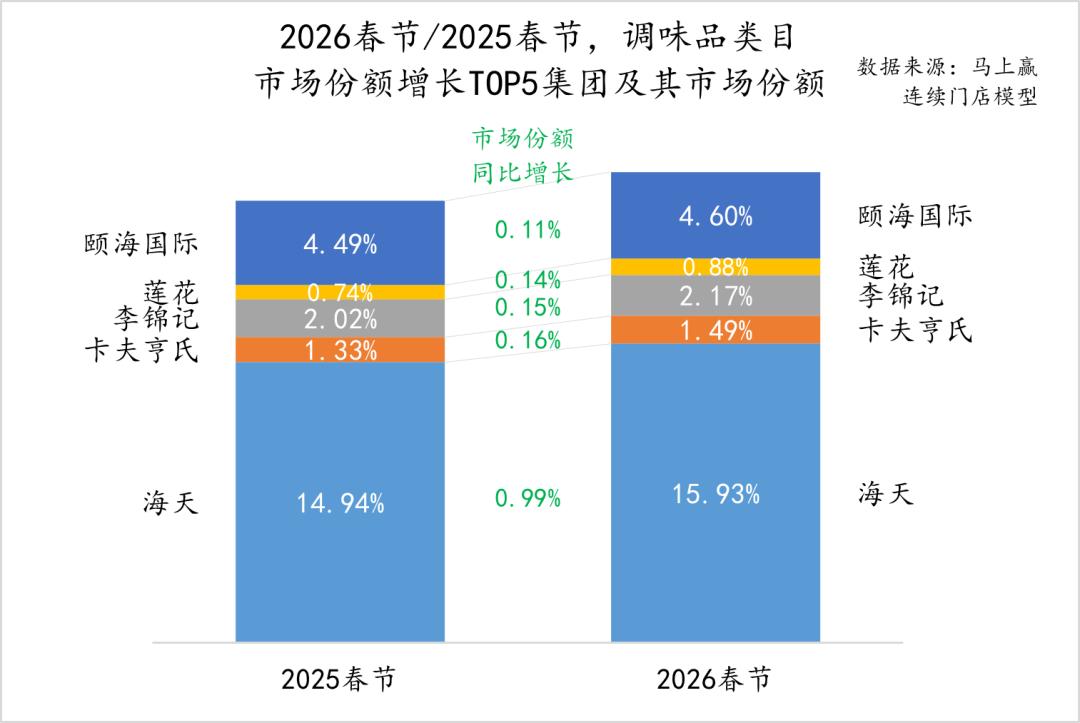 2026年春节同比2025年春节,调味品大类中的市场份额同比增长TOP5集团分别是海天、卡夫亨氏、李锦记、莲花与颐海国际。海天作为类目内市场份额较高的头部集团,其市场份额依然在过去的一年中保持增长,正逐渐在醋、蚝油等酱油之外的类目中站稳脚跟或是开花结果;其余集团中,莲花继续在提鲜粉中深耕,从传统的味精到更加创新的松茸鲜,也在逐步丰富自己的提鲜产品矩阵;颐海国际则是凭借与海底捞的关联,从火锅调料逐渐延伸到复合调味料、复合调味汁等类目,也在陆续形成自己与餐饮强相关的调味解决方案矩阵。