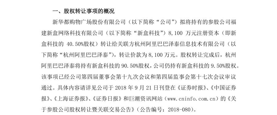 2018年4月,盒马在杭州开出首家自营门店,浙江业务开始转为直营;同年9月,新华都将新盒科技40.50%股权转让给杭州阿里巴巴泽泰,2019年10月正式退出;2019年5月,高鑫零售宣布向上海润盒出售海南盒马全部股权;2022年6月,贵阳星力退出贵州星盒纵横,贵阳盒马收归直营。