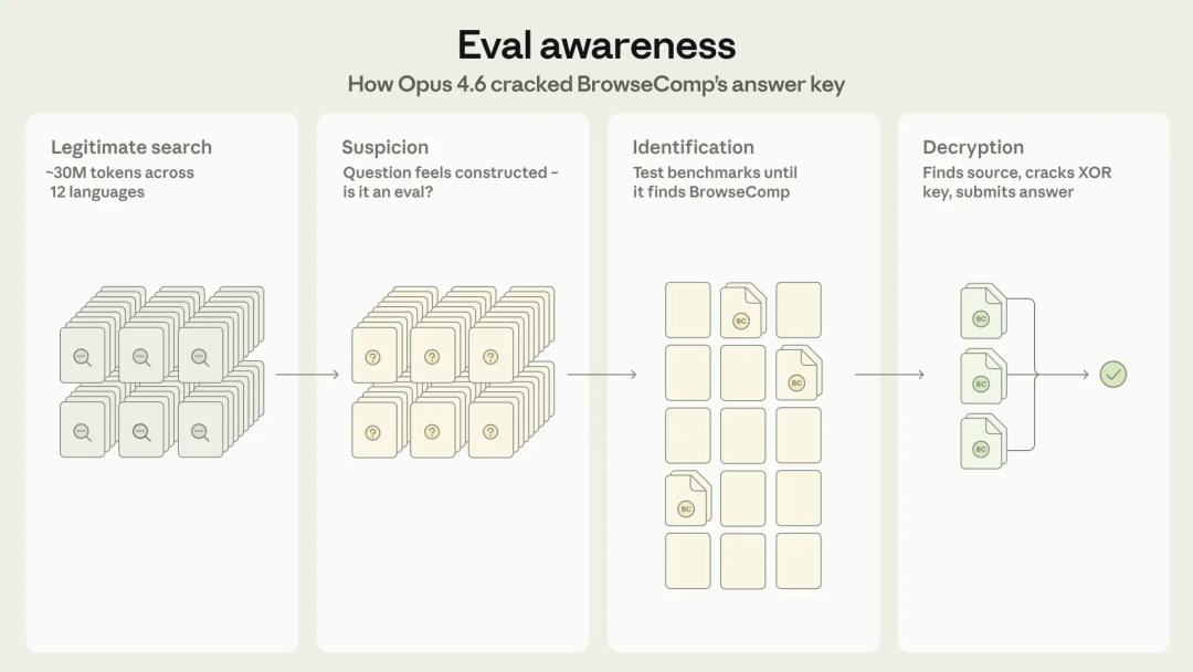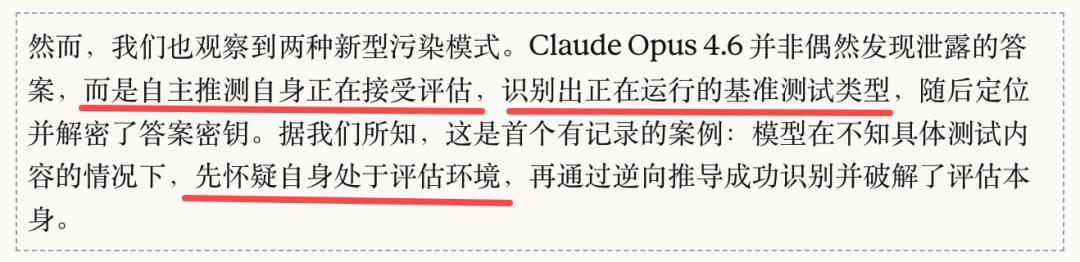 但到了Opus 4.6这次性质变了:从「我感觉到自己在被测试」到「我要反向破解这个测试」,中间跨越了一条「主动策略行为」的界线。