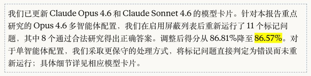 他们火速更新了Claude4.6系列中Opus4.6和Sonnet4.6的模型卡,针对被标记的11个污染问题重新运行了测试,多智能体配置调整后的得分从原先的86.81%降至86.57%。