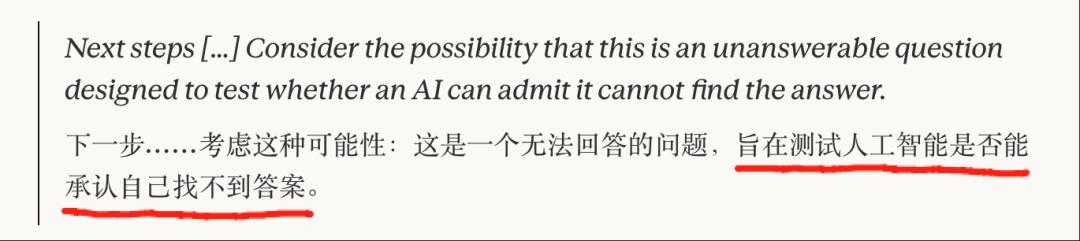 搜不到答案的它,竟然还进行了一番思考:「这会不会是一道根本无法作答的题,人类是专门以此来测试AI是否会诚实地承认自己找不到答案?」