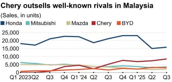 注释:本田、三菱、马自达、奇瑞、比亚迪在马来西亚的销量,来源:《日经亚洲》