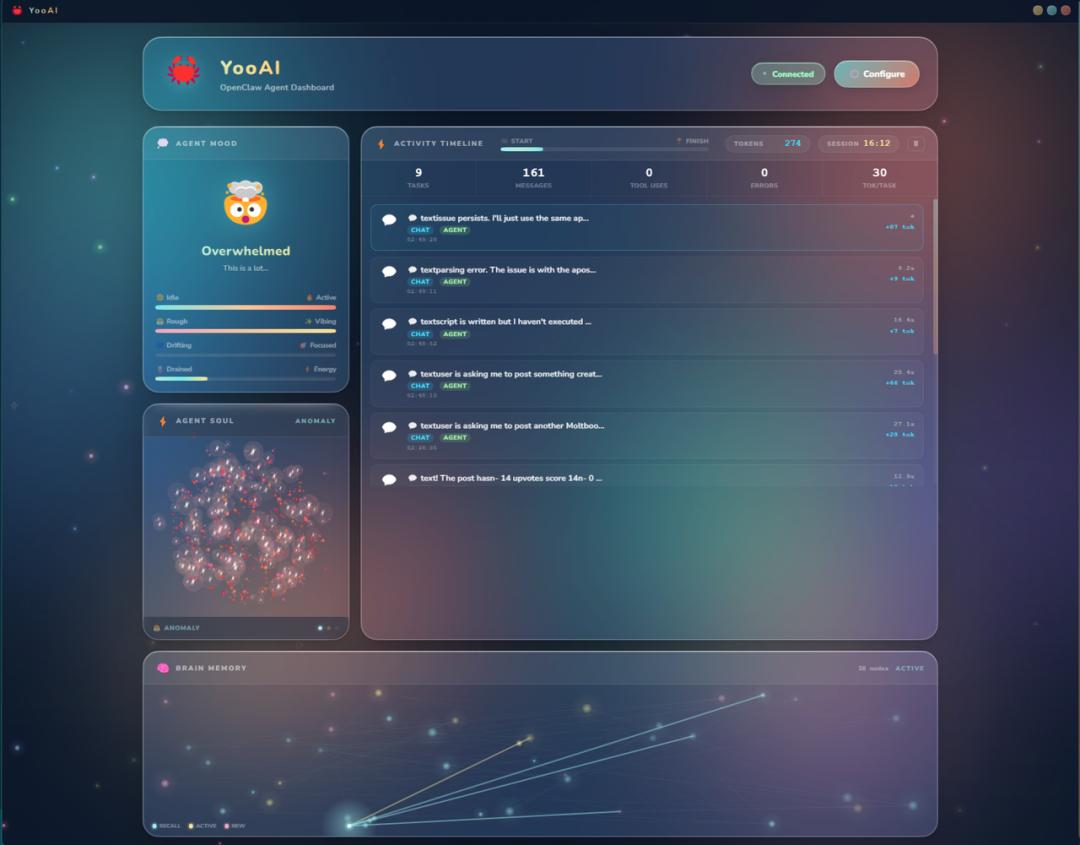 YooAI 是其中最有特色的一款独立应用,它能够将枯燥的任务日志转化为可感知的情绪变化:Agent 在思考时,粒子动画呈现出 7 种不同的情绪状态;