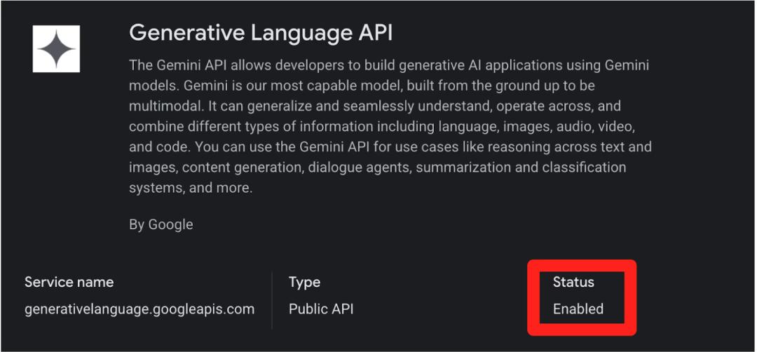 - Gemini API 已在同一项目中启用。(现在,同一个密钥可以访问 Gemini 的敏感端点。)