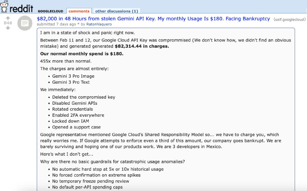 “简而言之,”他在帖子中总结,“Gemini API 密钥被盗,48 小时内产生 82,314 美元费用。我们正常月费 180 美元,飙升 457 倍。我们已经采取安全措施,但谷歌以‘共同责任’为由拒绝赔偿。如果坚持收取费用,我们将破产。”
