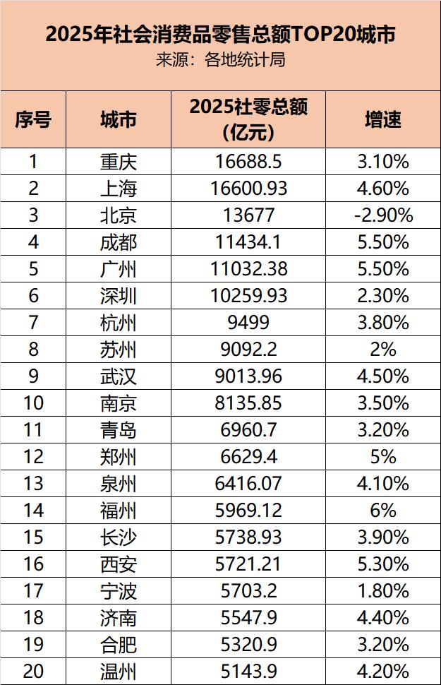 先说重点:重庆逆袭登顶,2025年社会消费品零售总额达到16688.5亿元,超过上海(16600.93亿元),成为中国消费第一城;成都反超广州、深圳,跻身中国消费第四城,在副省级城市排名第一;杭州一口气连超三城(苏州、武汉、南京),排名第七,跃升长三角消费第二城;青岛、郑州排名各上升1位;福州、西安排名各上升3位。