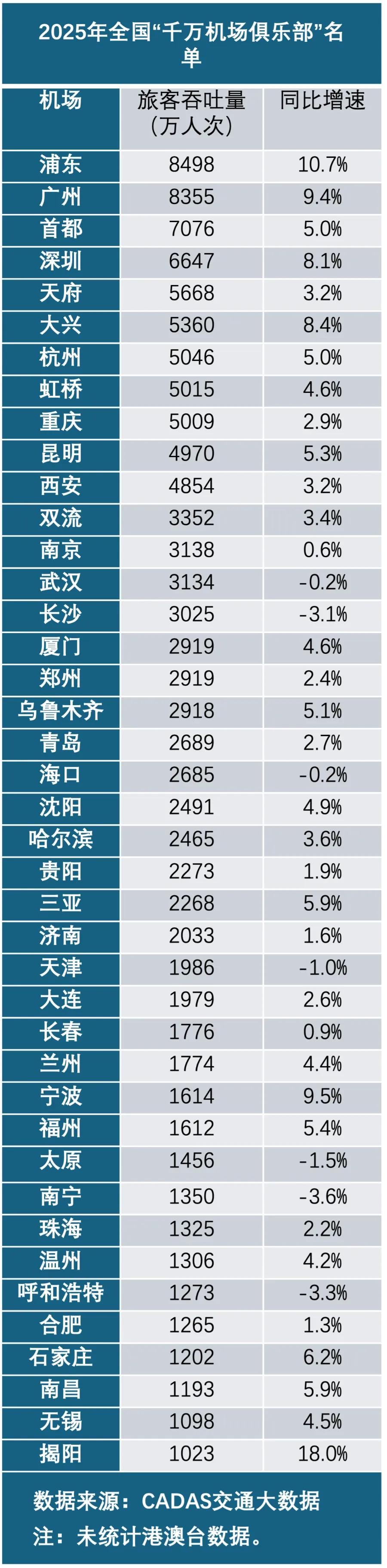 2025年,重庆江北机场年旅客吞吐量首次突破5000万人次,正式跻身全球“5000万级机场俱乐部”,位列全国第九。