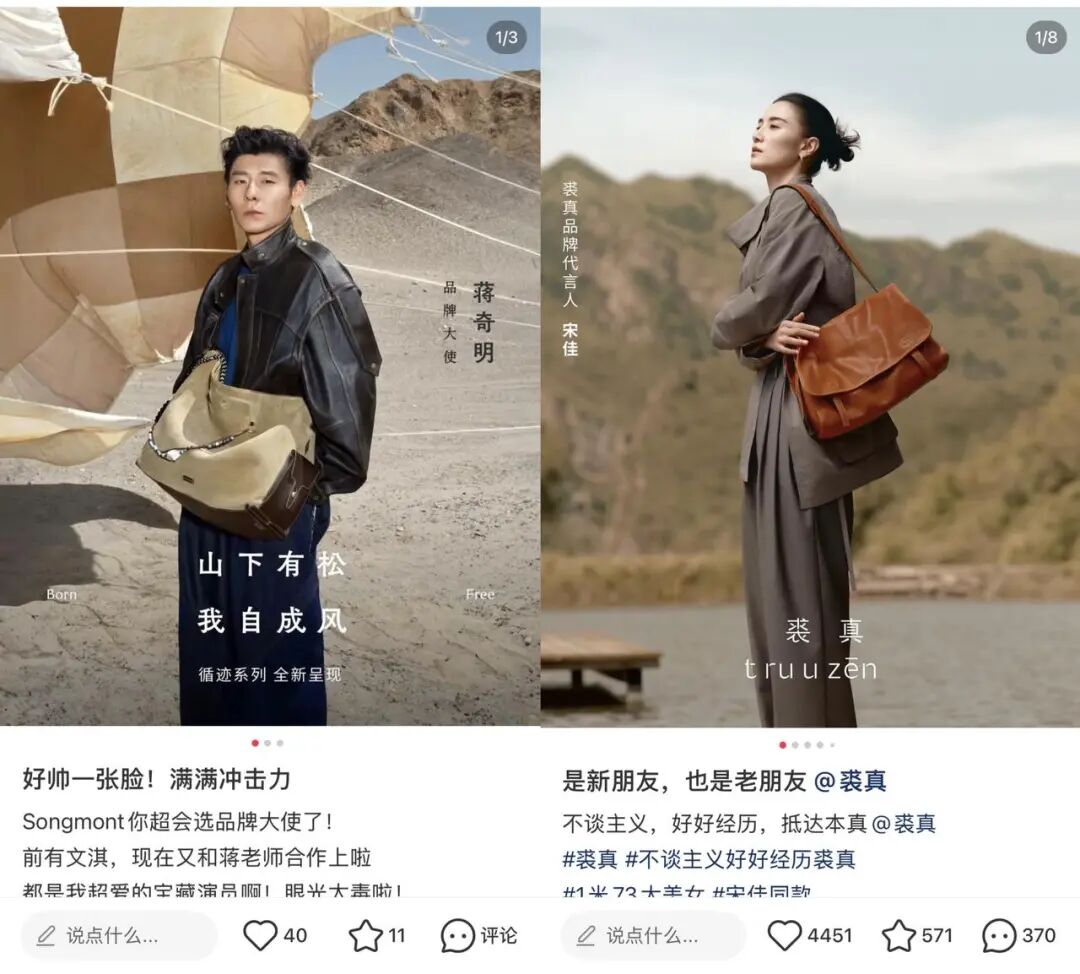 另一类,则是正在向更高价格带迁移的国产品牌,如山下有松、裘真。这些品牌并非新面孔,而是凭借一两款爆款包型逐步积累认知,在设计、材质和定价上持续向“轻奢”靠拢,并选择有独特个人风格的演员代言,完成从功能性产品到风格型品牌的转变。