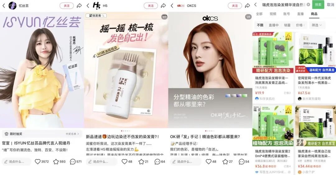 比如以忆丝芸、H5、OKCS 为代表的品牌,主要面向年轻人群,强调色彩多样、发色时尚,主要活跃在抖音、小红书等平台上,借助明星影响力和博主的推荐来建立认知。而在视频号上活跃的瑞虎等品牌,更多精准锚定中老年用户,主打“一洗就黑”、“自然遮盖白发”等功能诉求,满足该群体便捷、低调的染发需求。