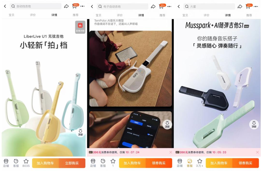 同样的逻辑,也体现在天猫上的LiberLive 、TemPolor、Musspark无弦吉他等智能乐器中。它们并非面向专业玩家,而是通过降低学习门槛、强调新鲜体验,让更多普通用户愿意尝试智能化的玩乐新可能。
