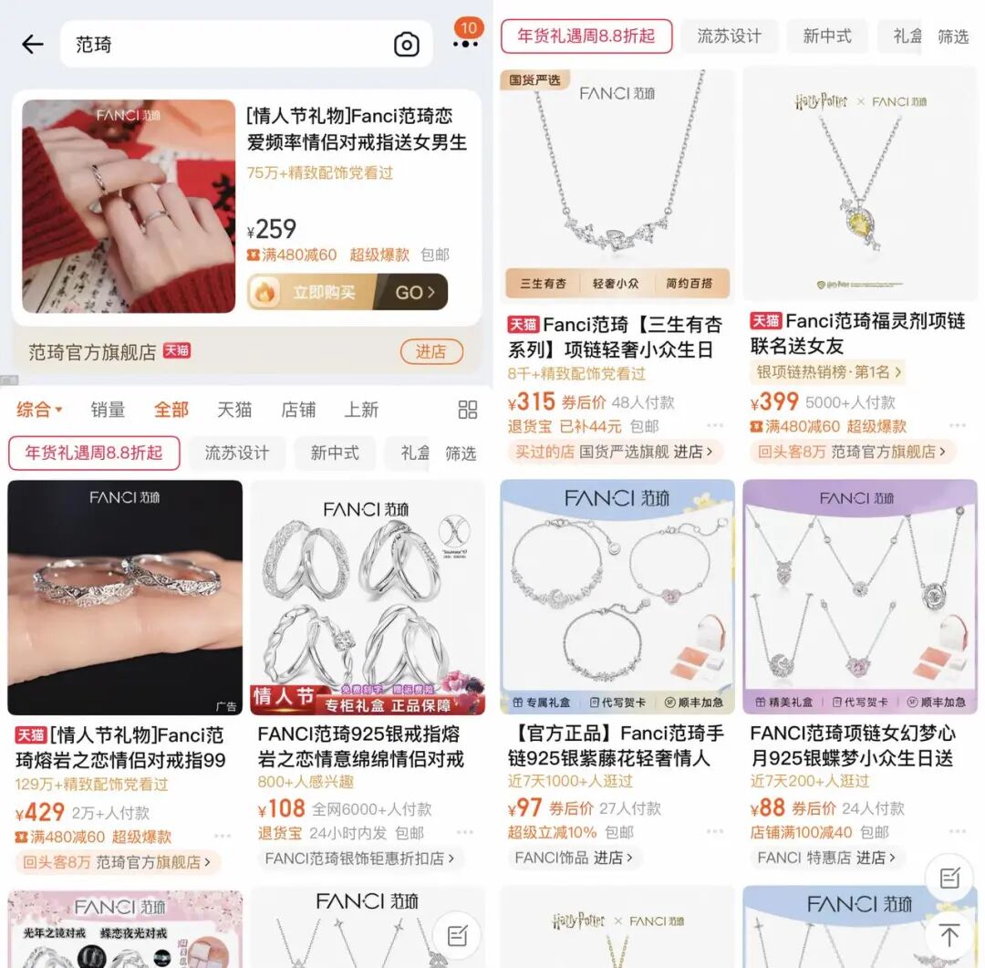范琦正是这一逻辑下的代表品牌。以银饰为主,款式数量庞大,持续与明星和 IP 合作,大量产品定价集中在 500 元以内,在多个平台的种草榜中保持高曝光。对消费者而言,这类品牌并不承担长期持有或保值的期待,而是一种可以随心更换的审美选择。