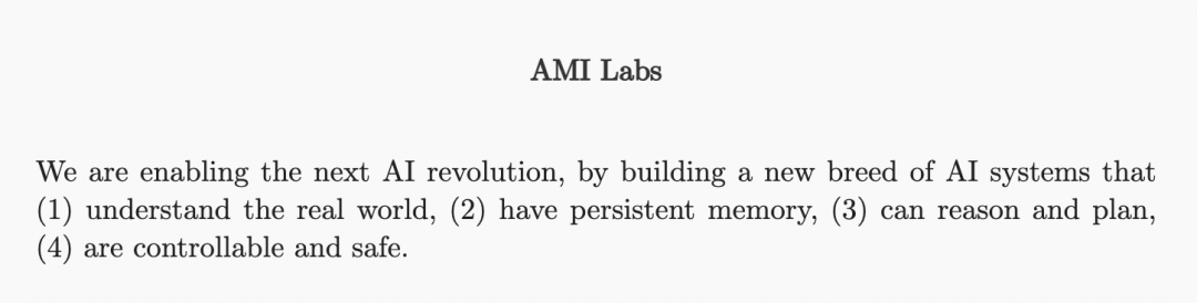 为了实现这一目标,AMI 将打造全新一代的 AI 系统,去理解世界,具备长期维持的记忆,能够进行真正的推理和计划,并且在端到端安全可控。