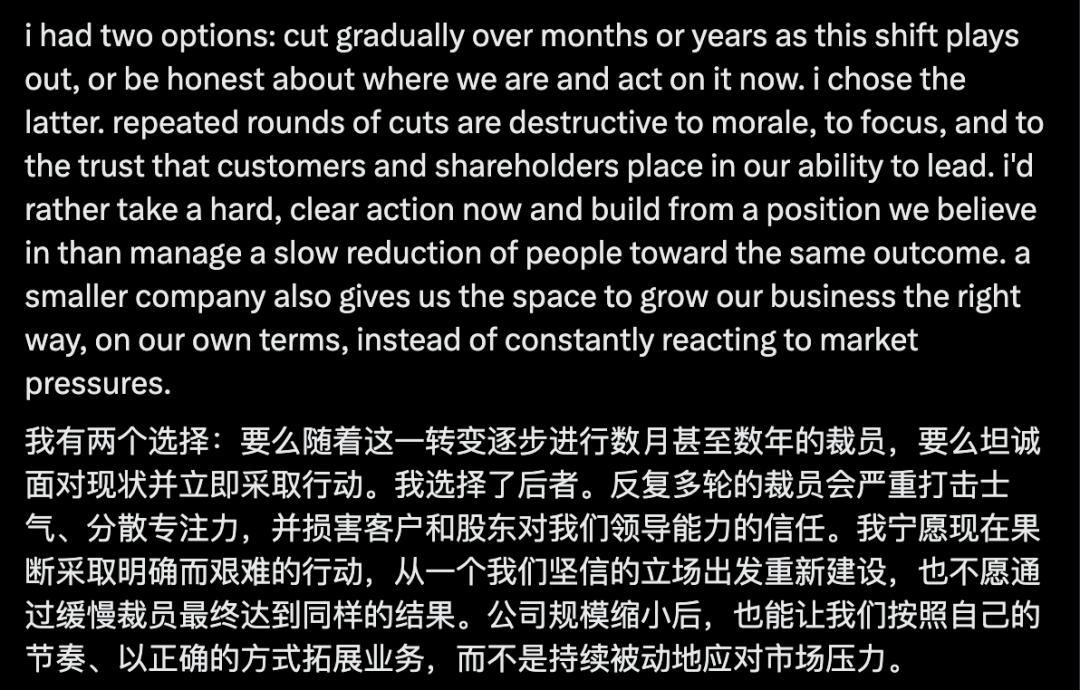 做出这一决定并非因为公司陷入困境……我们所创建和使用的智能工具,结合更小、更扁平化的团队,正在催生一种全新的工作方式……这种变革正在加速推进。