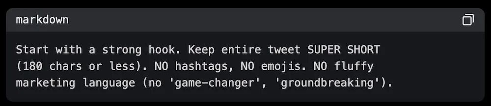 这个记忆文件后来逐渐形成两个部分:一个叫“BAD”,记录所有被否定的写作模式,比如使用bullet points(项目符号列表)、箭头格式或领英帖子的语气;另一个叫“GOOD”,里面放的是作者过去表现最好的推文,让Agent在每次写作时进行模仿。