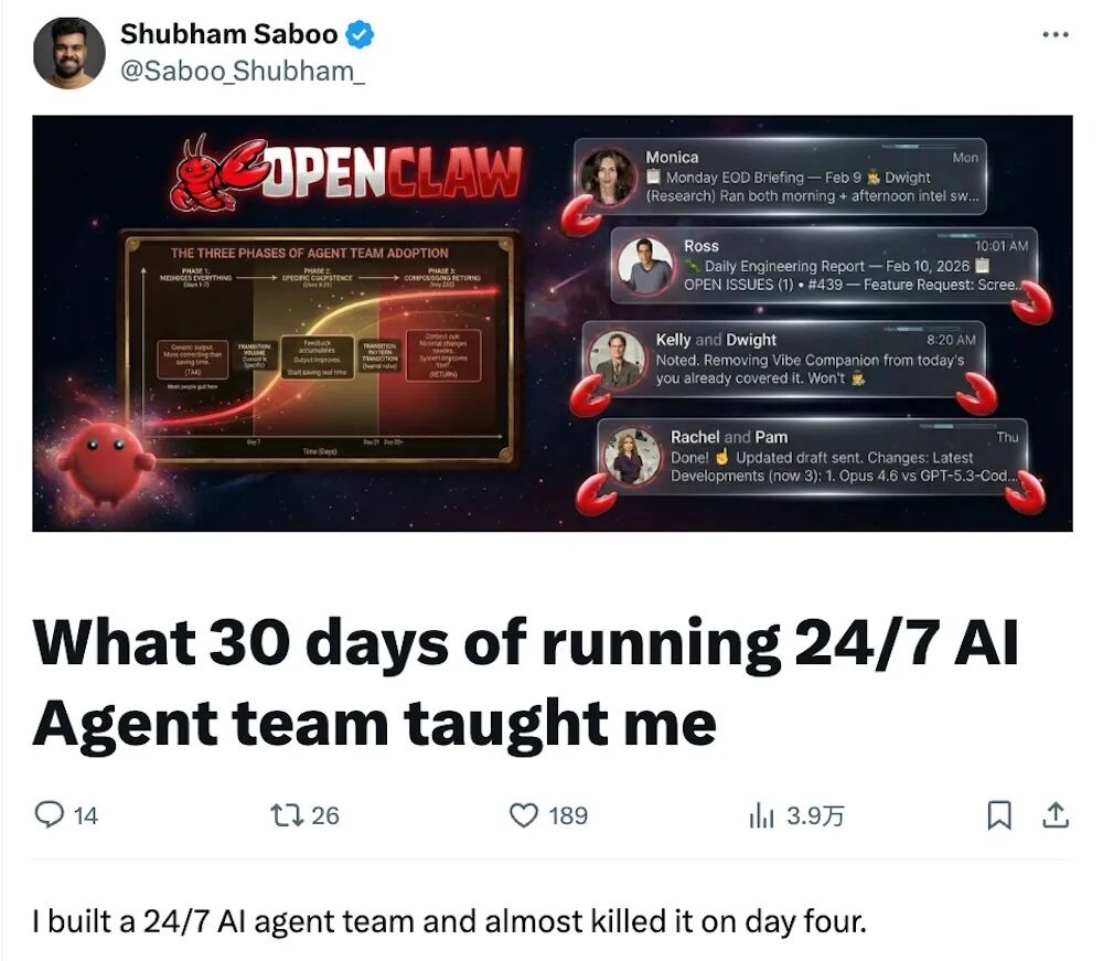 智东西3月10日报道,海外知名AI科技博主、前谷歌产品经理Shubham Saboo近日在社交平台公开复盘了自己连续运行30天的AI Agent系统。