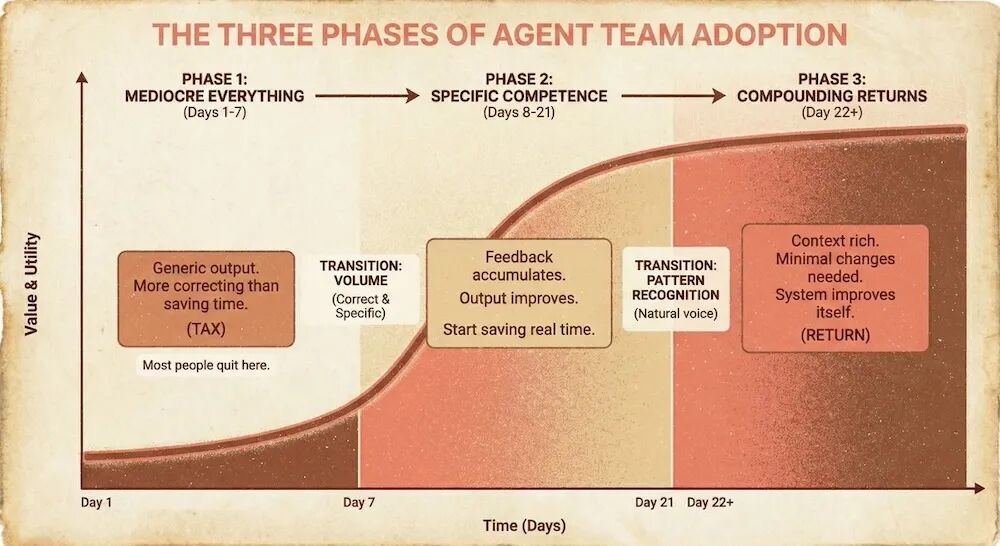 第三阶段是复利期。当系统积累了足够多的规则和上下文后,Agent会逐渐理解用户的表达习惯和判断标准,新任务也能继承过去的经验,整体效率明显提升。
