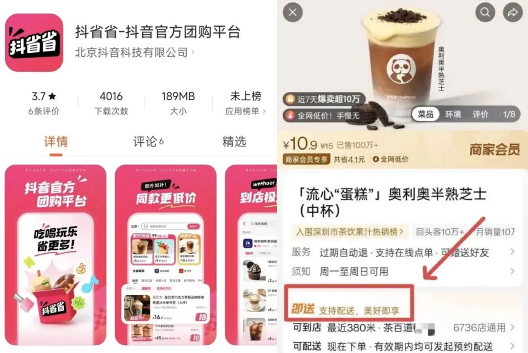 3月,抖音生活服务旗下"随心团"正式更名为"抖音即送",定位面向优质堂食商家的品质外卖服务,同一套餐同步支持到店核销与配送到家双场景,此举旨在突出配送属性,契合用户对高品质外卖的刚需。