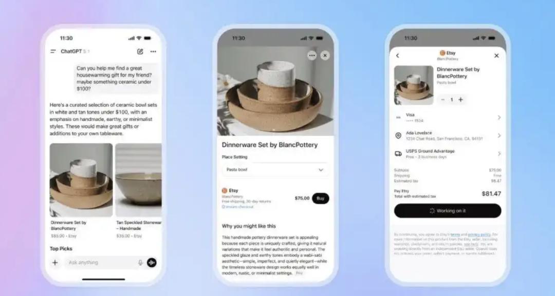 OpenAI于2025年高调宣布与Etsy、Shopify、Stripe等巨头合作,承诺将数百万线上商家的商品库接入ChatGPT,并计划通过销售分成构建盈利模式。OpenAI推出Instant Checkout(即时结账)功能,将购物流程直接融入ChatGPT的聊天界面,让用户能在一键之间完成从选购到支付的全程。