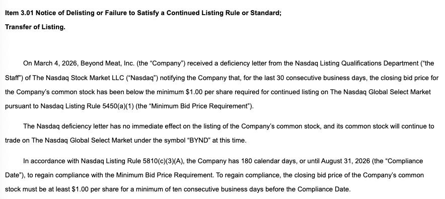 值得一提的是,据别样肉客纳斯达克公告,就在3月4日,其还收到了纳斯达克上市资格部的质疑函。公告显示,根据纳斯达克上市规则,在过去连续30个交易日中,公司普通股的收盘价低于纳斯达克全球精选市场持续上市所需的每股最低1.00美元,从而触发了相关警告。公告提及,若公司未能在2026年8月31日前重新达到最低买入价要求,或面临摘牌风险。