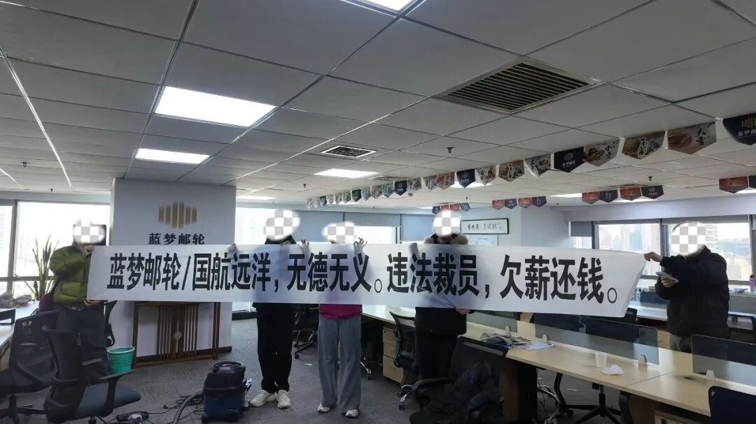 2026年2月,上海宝矿国际大厦写字楼里,几名年轻人在蓝梦邮轮LOGO下展开了一条白色欠薪横幅。