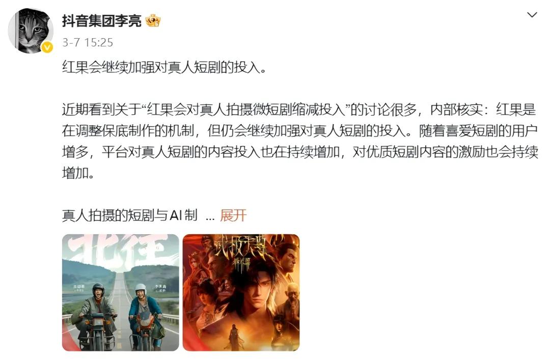 此前,网络传言称红果将对真人拍摄微短剧缩减投入,而后抖音集团副总裁李亮在线辟谣:“内部核实:红果是在调整保底制作的机制,但仍会继续加强对真人短剧的投入”,他还表示“真人拍摄的短剧与AI制作的短剧各有优势,两者覆盖了不同的人群,可以满足不同用户的文化需求。”