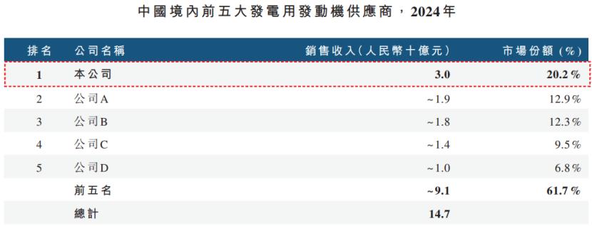 当前中国发电用发动机市场较为集中,大功率高价值产品集中在头部企业。2024年中国境内前五大发电用发动机供应商合计销售金额约占中国市场总额的61.7%。