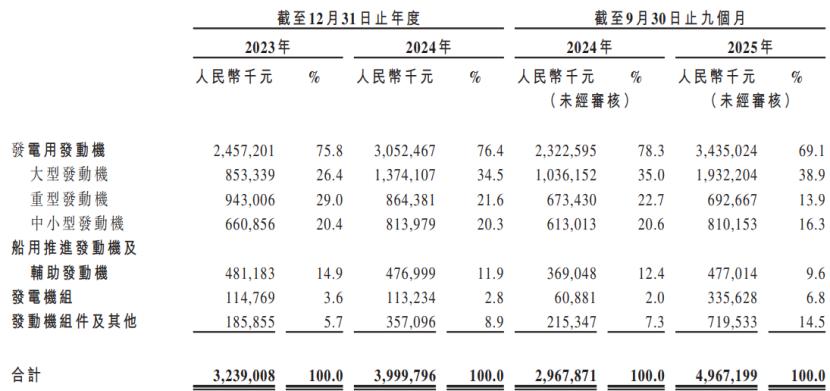 具体来看,2023年至2025年1-9月(简称“报告期”),玉柴船电来自发电用发动机产品的收入占比有所下降,但仍在70%左右;船用推进发动机及辅助发动机的收入占比有所下降,发动机组件及其他产品收入占比有所提升,发电机组的收入占比较低。