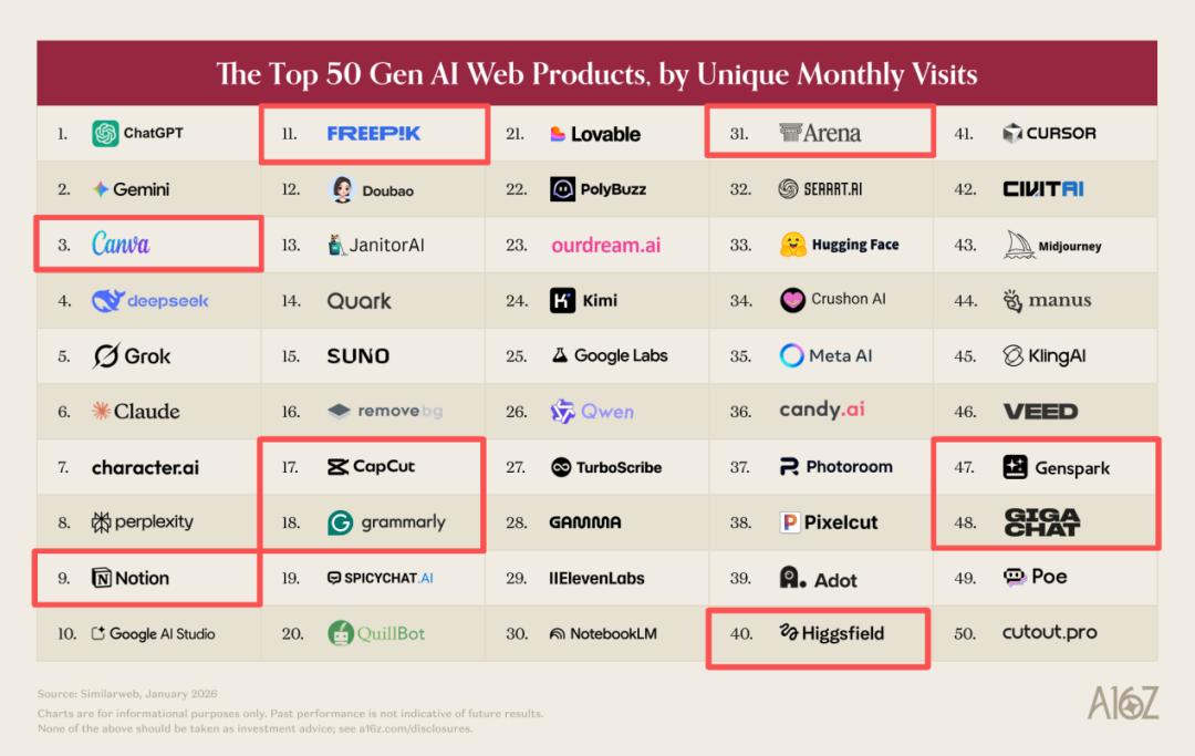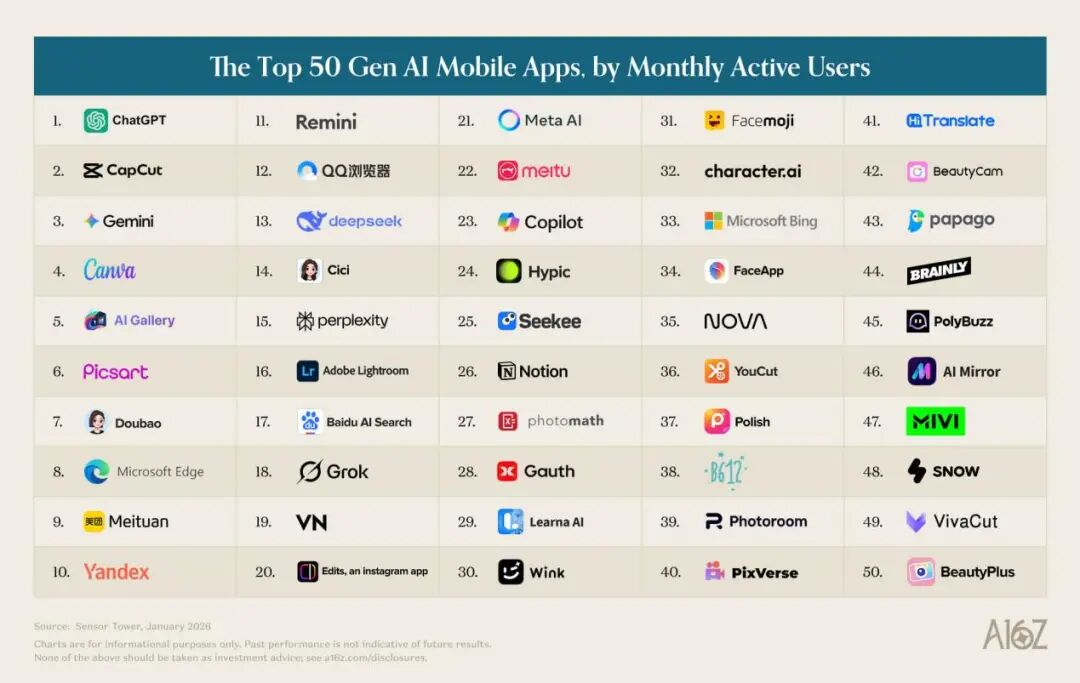 3 月 10 日,a16z 发布第 6 期全球 Top50 AI 产品榜单,与以往一样,本期榜单仍分 App 和 Web 端,分别参考 2026 年 1 月 Sensor Tower 的 MAU 数据和 Similarweb 的访问量数据。相比此前榜单,本期榜单最大的变化在于,a16z 调整了收录范围,因为深度集成 AI 功能且收入更多来自 AI 能力,本次报告将此前规避掉的 CapCut、Canva、Notion 等融入了 AI 功能的老产品纳入了榜单。