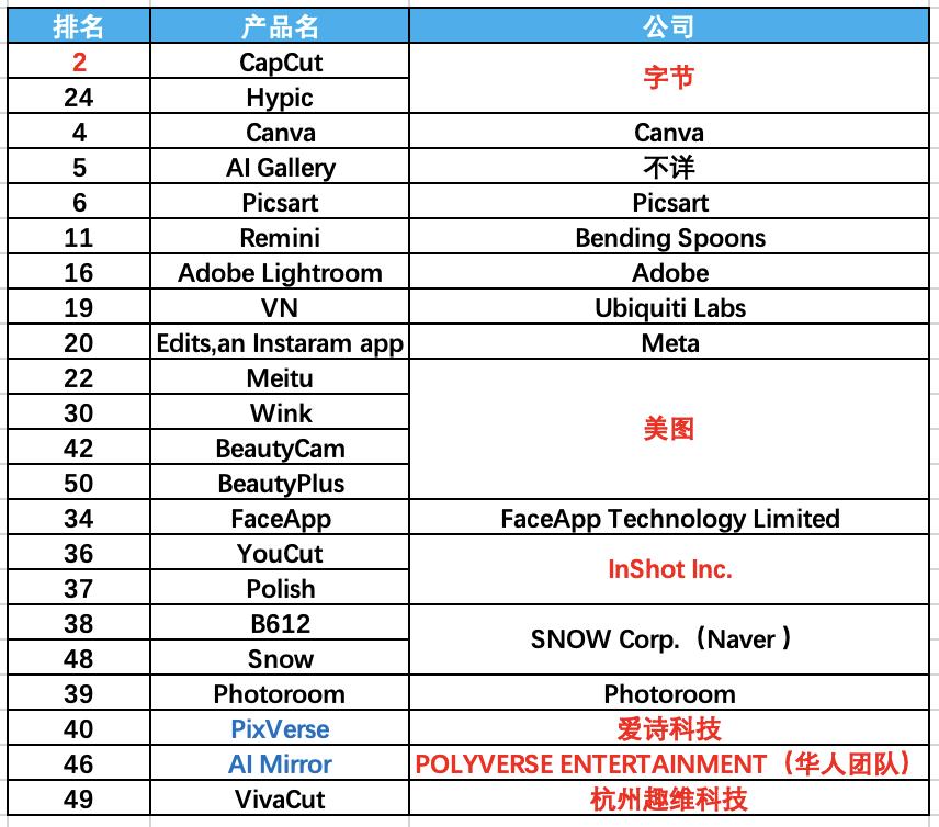 图像音视频入榜产品(注:红色字体为出海开发者或华人团队,蓝色字体为以“生成功能”为核心的产品)