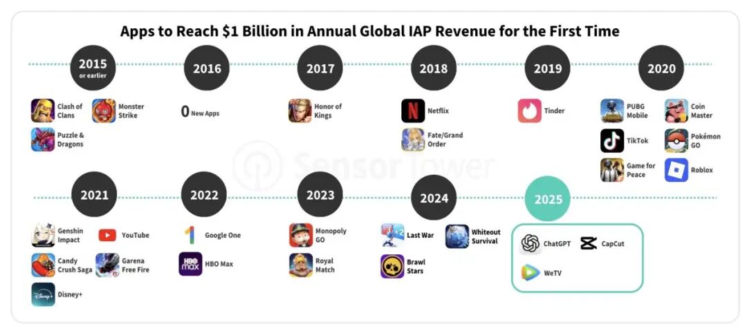 图注:历年年流水突破 10 亿美元的移动端产品|图片来源:Sensor Tower