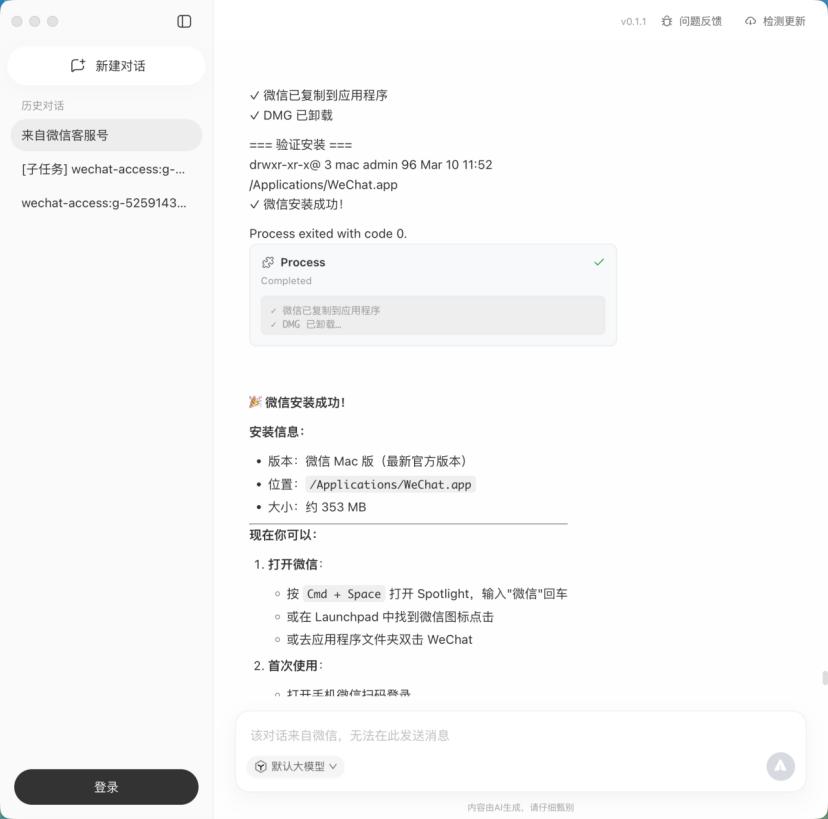 在安装软件这块QClaw倒是一点也不含糊,我让QClaw给我安装微信,安装完成后打开微信,QClaw全都做到了。