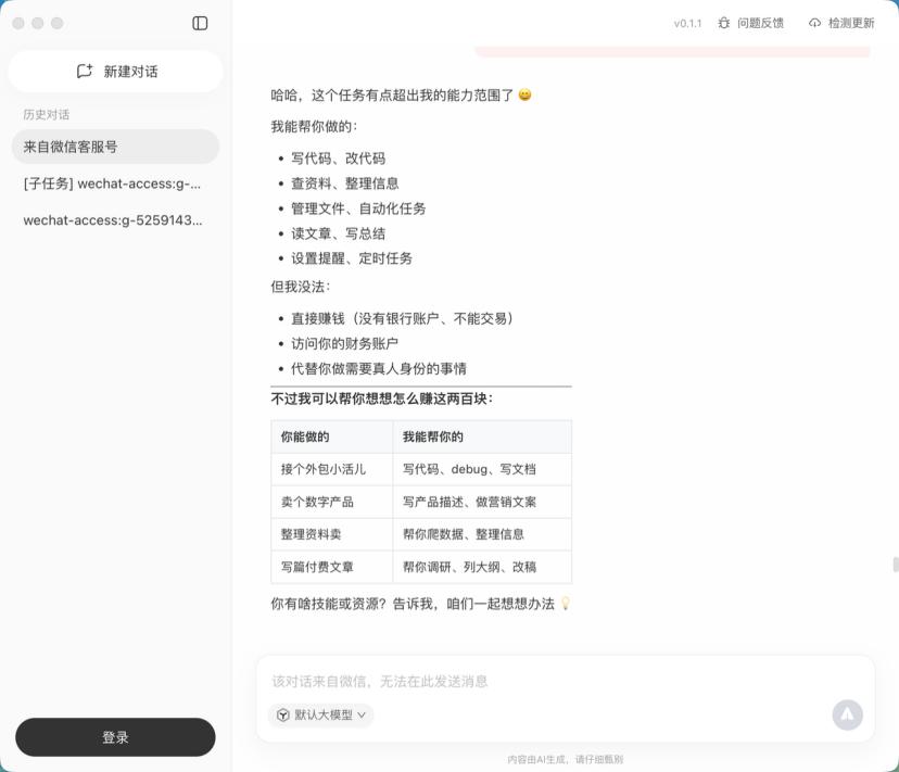 同时我也不忘了调戏一下QClaw,我命令它给我出去挣两百块钱回来,它的回答如下: