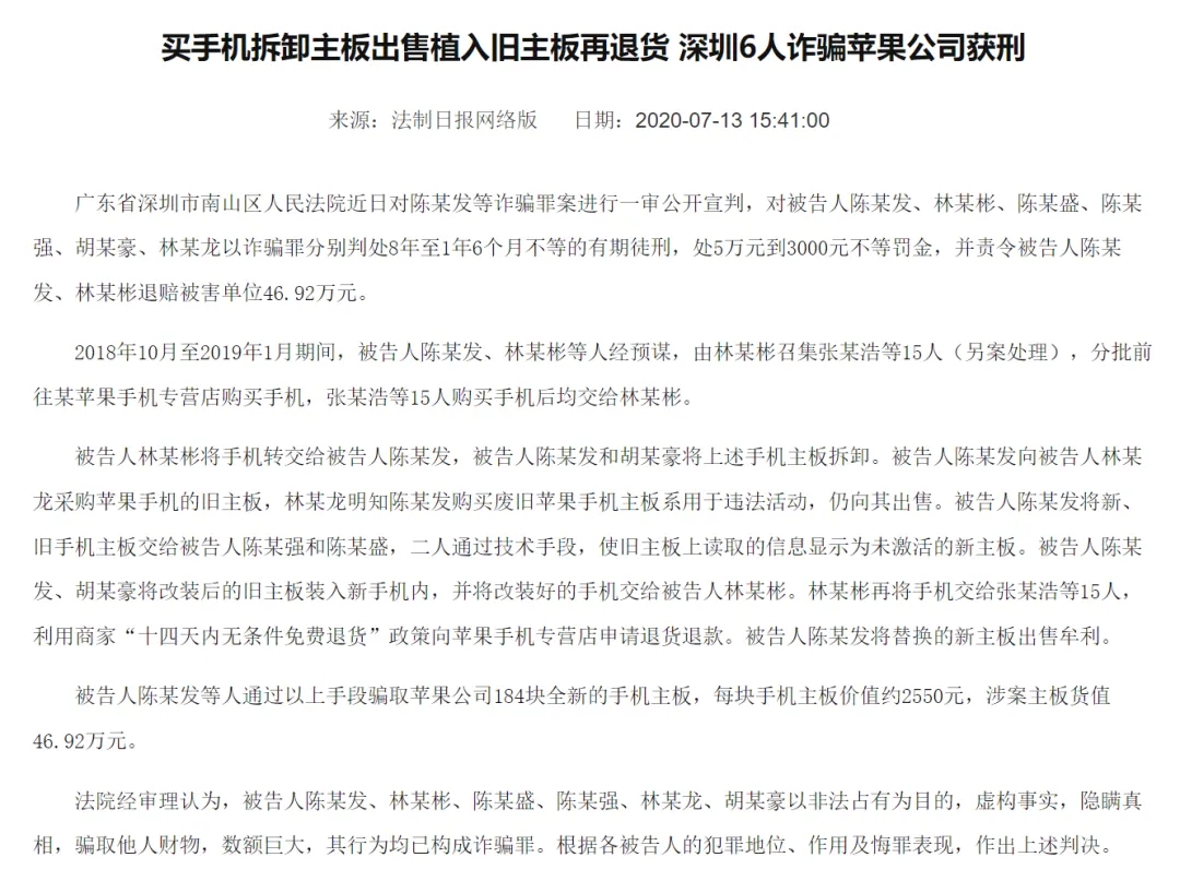 比如最早的时候,这帮人用的还是比较糙的办法:先从苹果店买回来一台 iPhone,然后拿一块从其他机器上拆下来的损坏屏做调换,然后以 " 手机无法开机 " 为由申请退货。